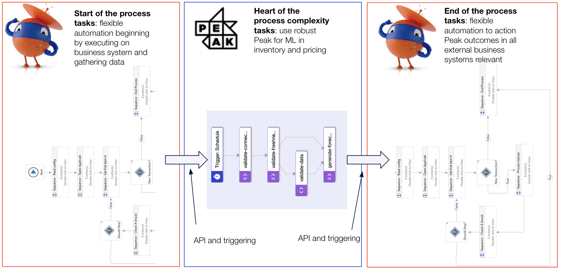 But what happens before or after we make a complex decision on Peak? Decisions like what should I offer in terms of price for this particular customer, in this region, with this complex basket of goods? How do we allow organizations to transform complex decision intelligence in their supply chain, to true end-to-end process augmentation and automation, with Peak at the core of this process? This is where UiPath comes in.Â