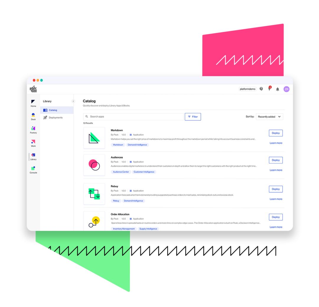 Library is the key to unlocking the immense potential of AI in your business. While most AI platforms just offer you the tools, Peak’s library of configurable applications enables you to deploy AI across your business easier than ever before – speeding up adoption and ensuring outcomes are achieved.