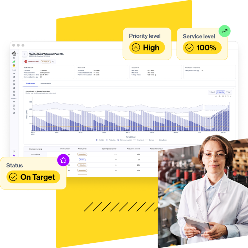 Optimize production with AI-powered planning. Manufacture the right products in the most efficient quantities to maximize service levels without holding too much stock.