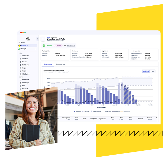 Inventory AI can give you SKU-level demand forecasts across your entire range, including the distribution of size for fashion retail. Its rebuy capability automates the process of analyzing your data and utilizes a sophisticated rebuy point formula to recommend when and how much stock to rebuy. It helps you keep your availability at that sweet spot, where you don’t miss out on sales or tie up working capital in excess inventory.