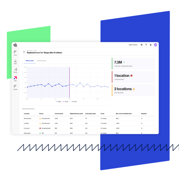 Inventory AI’s Replenishment module is built on Peak’s platform. It uses AI-powered forecasting and stock optimization models to recommend dynamic safety stock levels and replenishment points for every store to ensure you have the right stock cover.
