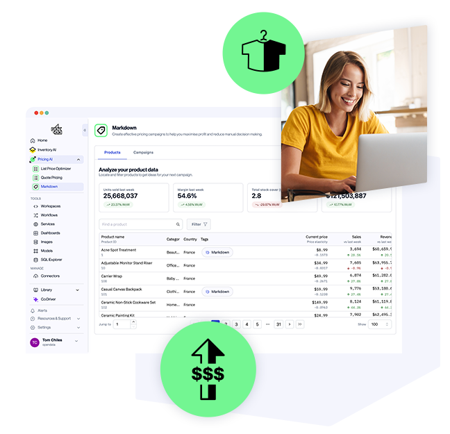 Pricing AI’s markdown optimization software gives you SKU-level markdown suggestions for any location or channel. It does this by applying AI models to your inventory, transaction and pricing data, while taking into account business targets and constraints.