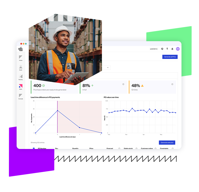 Purchasing’s procurement management software is built on Peak’s platform. It uses AI models to recommend optimal purchasing quantities and dates for every product across all your sites. It minimizes costs and helps you achieve target service levels. The application’s procurement software factors in business-specific constraints like safety stock levels, reorder points, minimum order quantities, backorders, space constraints, branch transfers, supplier agreements, and more.